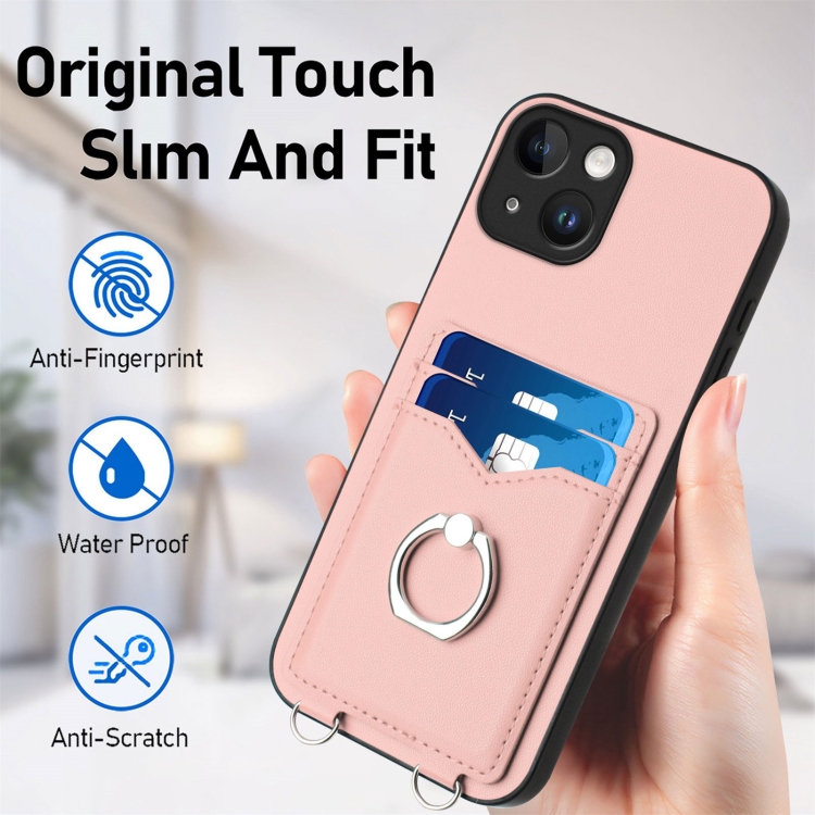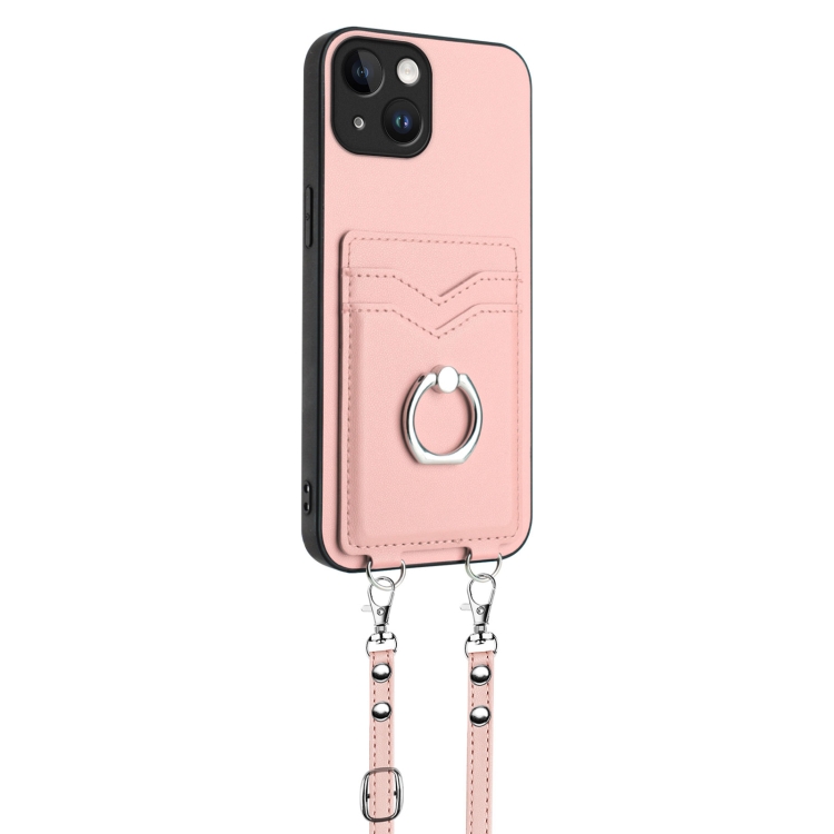 Funda para Teléfono iPhone 13 R20 con Soporte para Tarjeta y Anillo de Cuerda Cruzada (Rosa)