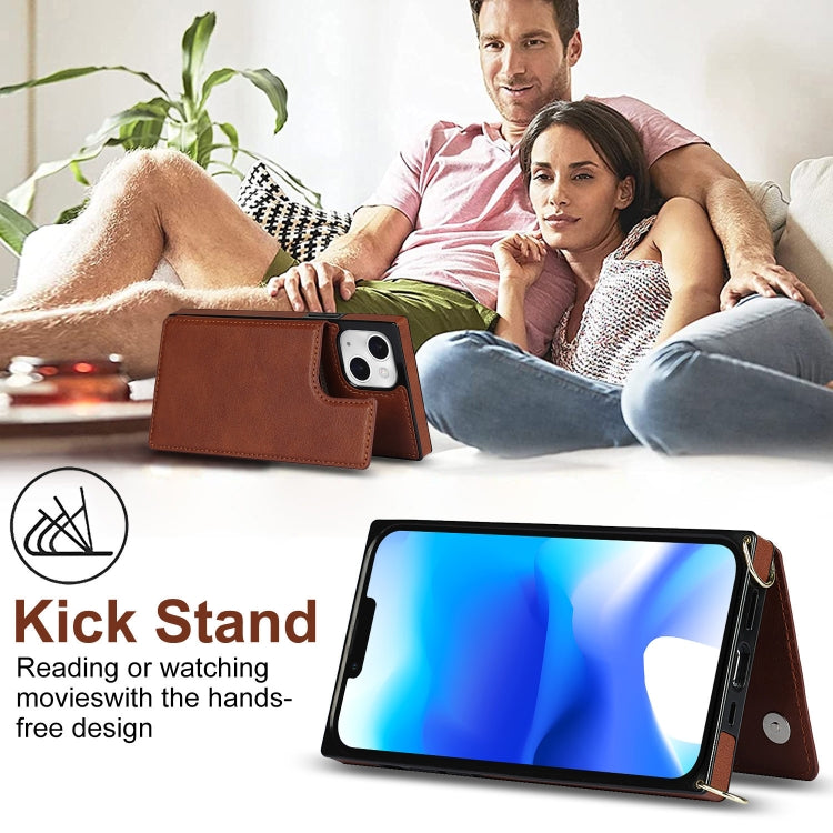 Funda para iPhone 14 Cross-Body Square Dual-Hebilla Tarjeta Flip Wallet (Marrón)