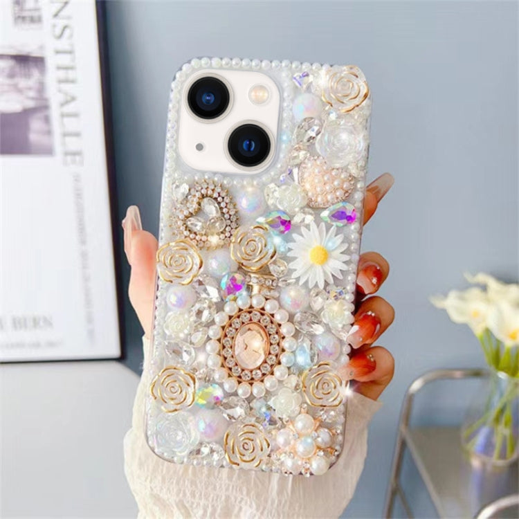 Estuche para Teléfono iPhone 14 con Rosa con Incrustaciones de Diamantes (Blanco)