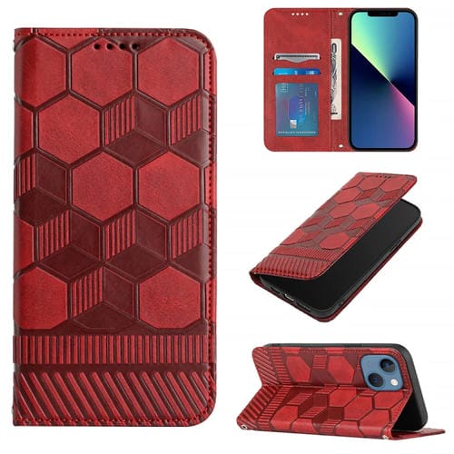 Funda de teléfono para iPhone 14 con tapa de cuero magnético textura de fútbol (Rojo)
