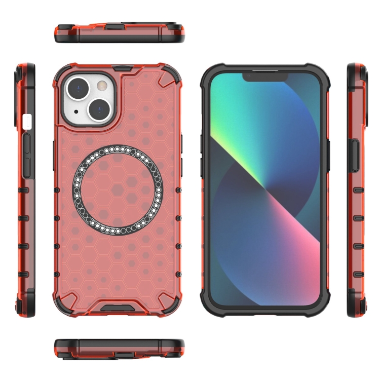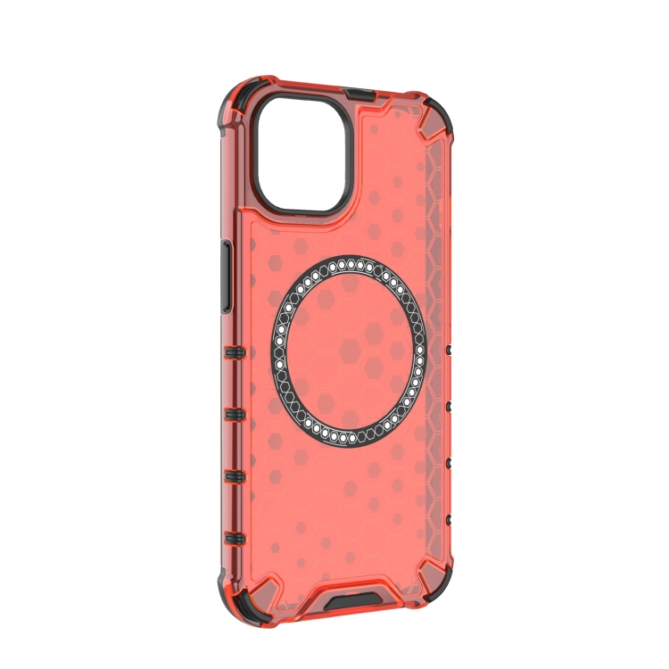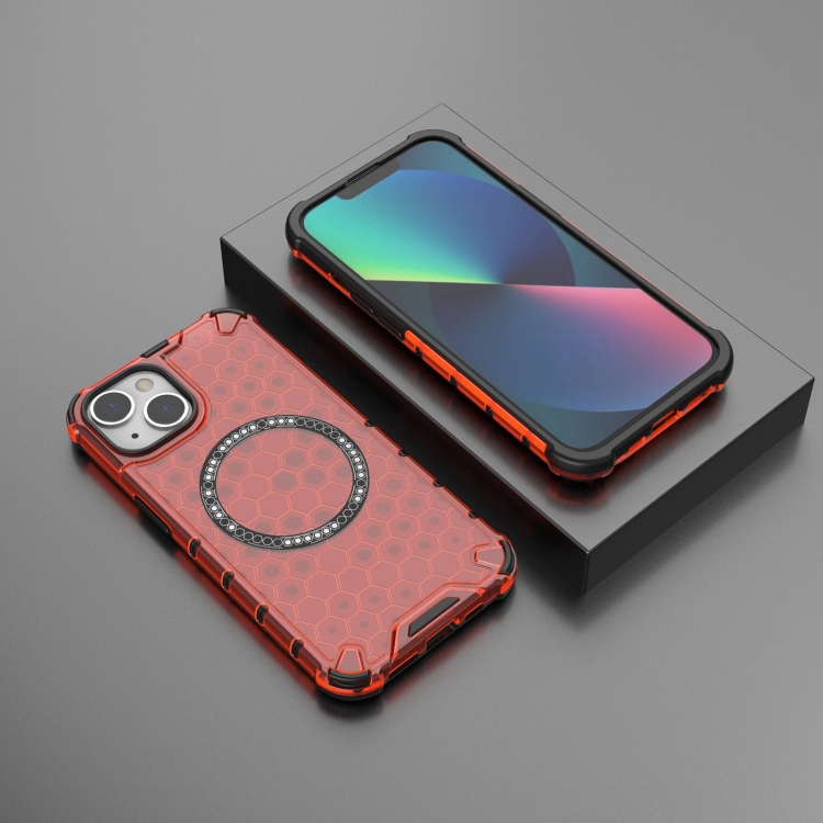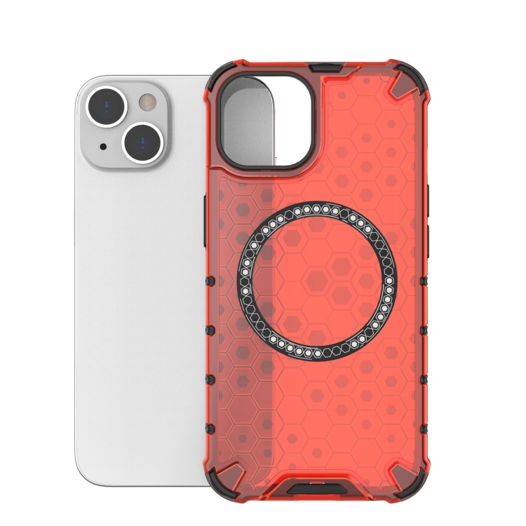 Funda para Teléfono iPhone 14 a Prueba de Golpes con Anillo Magnético en Forma de Panal (Rojo)