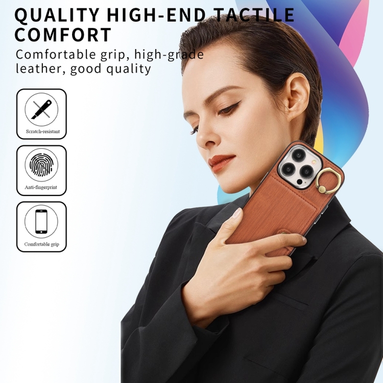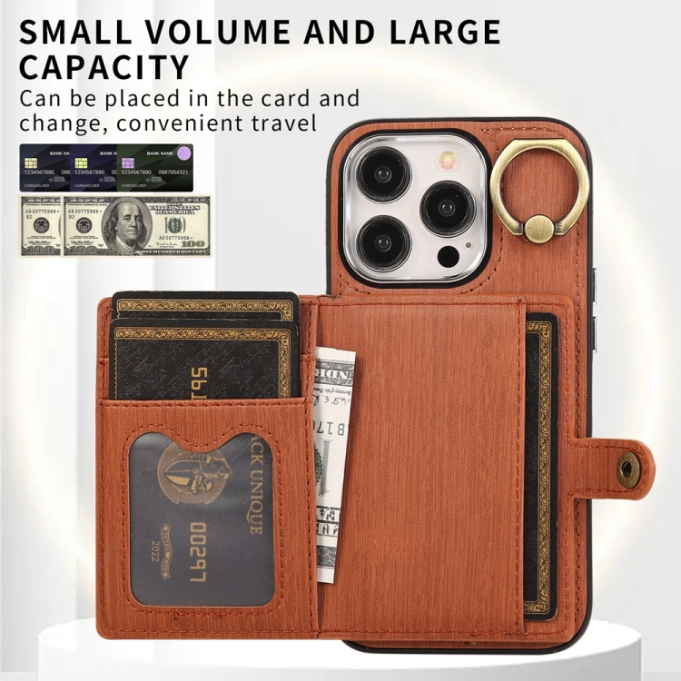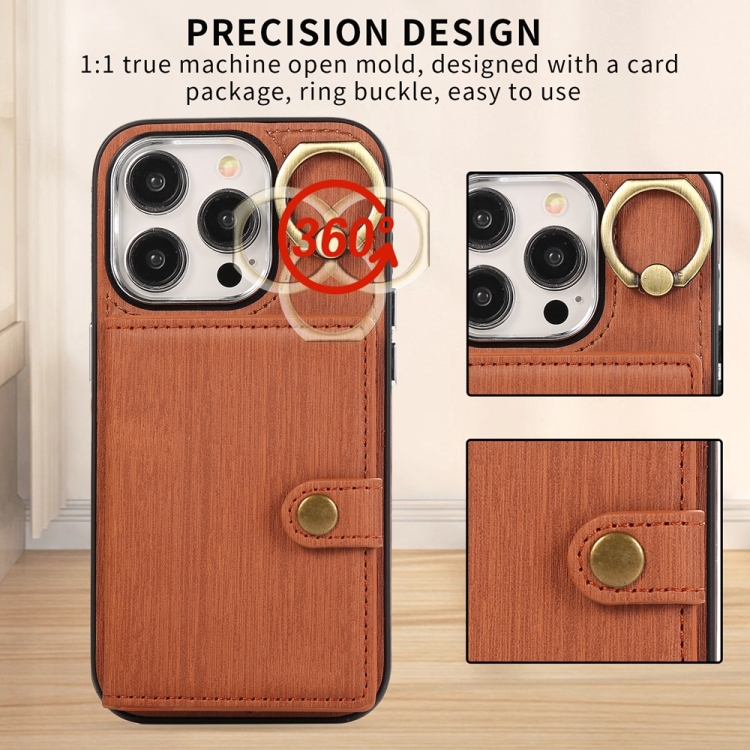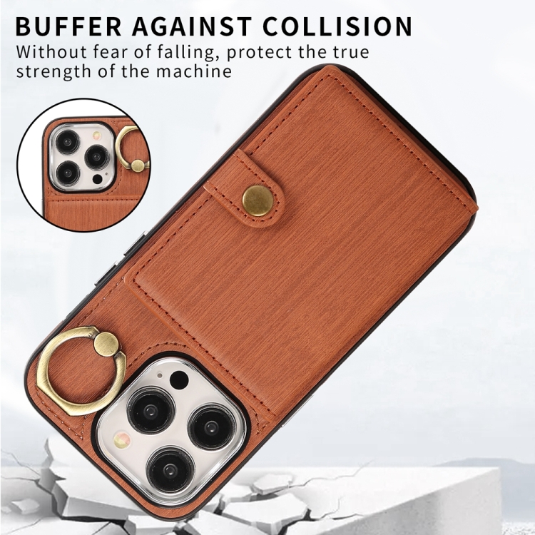 Funda para Teléfono iPhone 14 con Soporte para Anillo y Billetera con Textura Cepillada (Marrón)