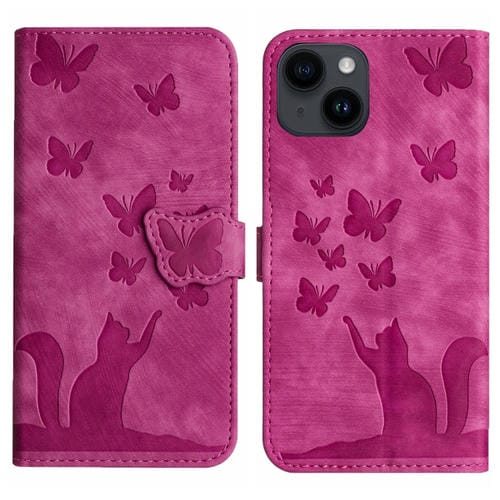 Funda para Teléfono iPhone 14 Cuero con Tapa Estampado de Gato Mariposa (Rosa)