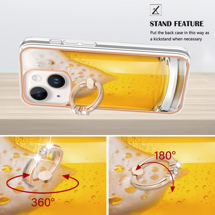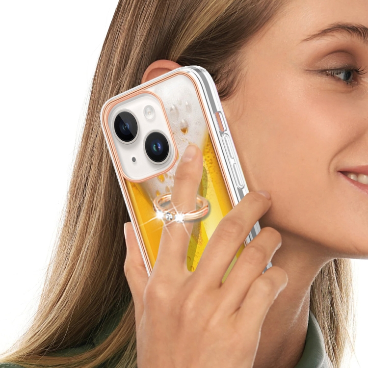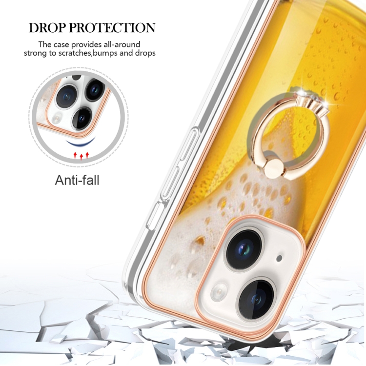 Caja de teléfono para iPhone 14 Plus Galvanoplastia IMD doble cara con soporte para anillo (Cerveza de Barril)