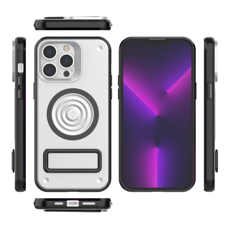 Funda para Teléfono iPhone 14 Pro Max PC + TPU Textura Fibra de Carbono con Soporte de Metal (Blanco)