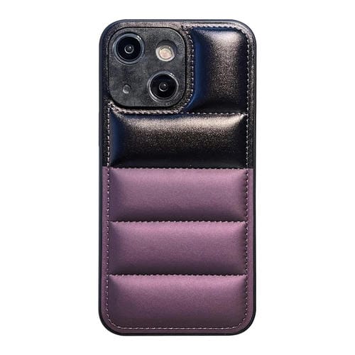 Funda para teléfono iPhone 15 con chaqueta de plumón y bloques de color (Negro Morado)