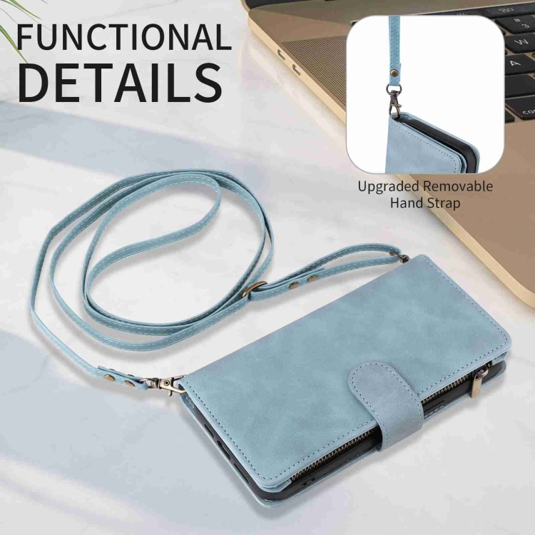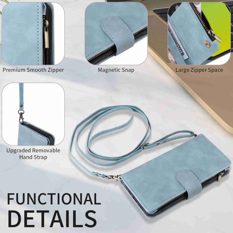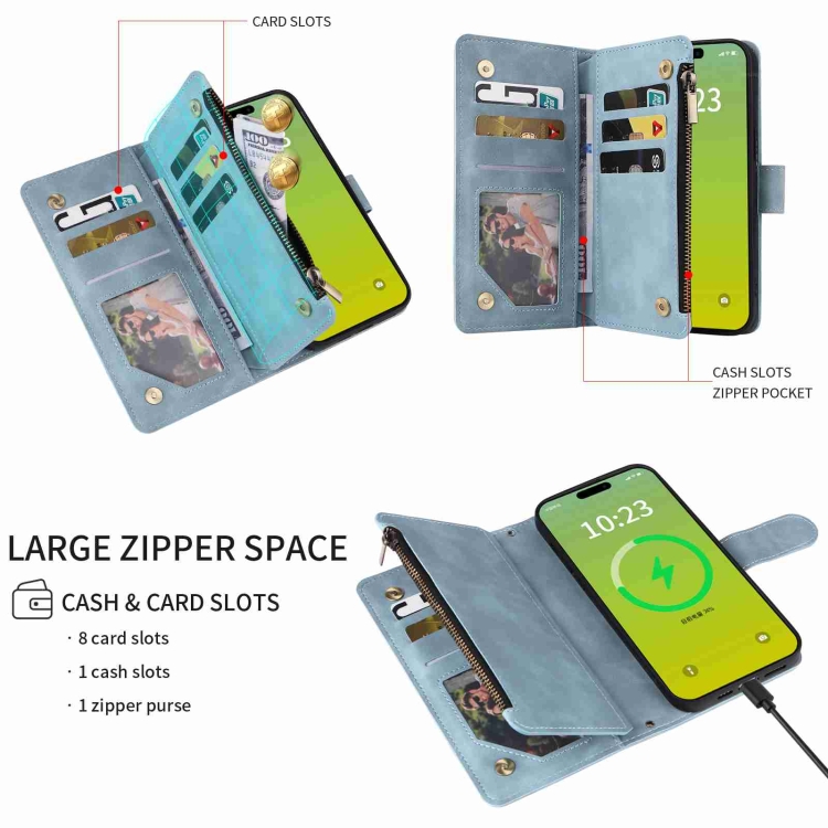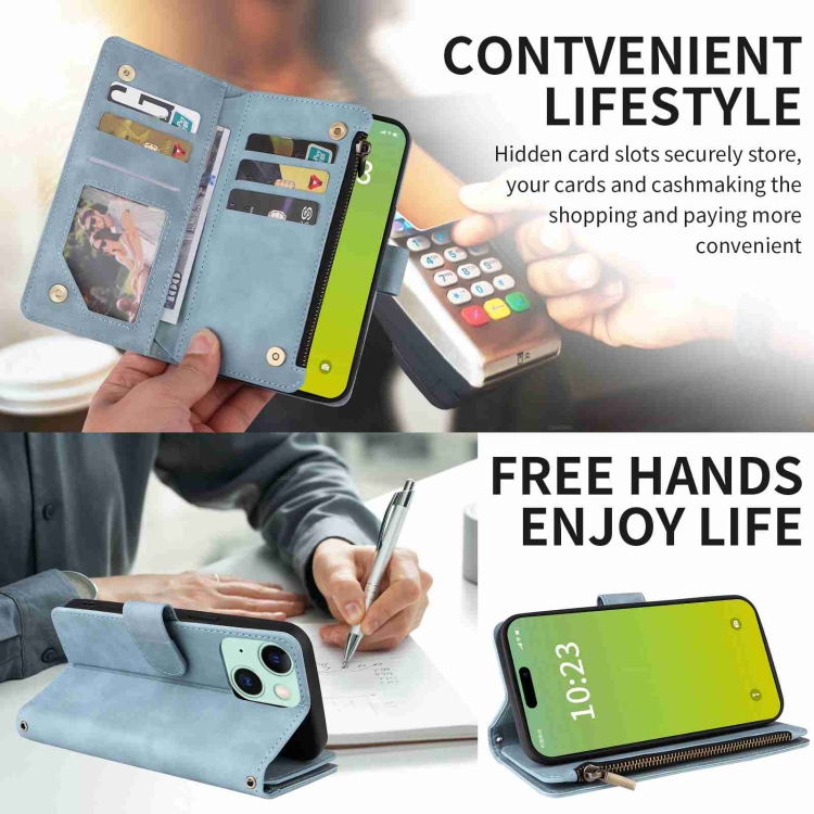 Funda para Teléfono iPhone 15 Cuero con Cremallera y Ranura para Tarjetas Cruzadas (Azul Claro)