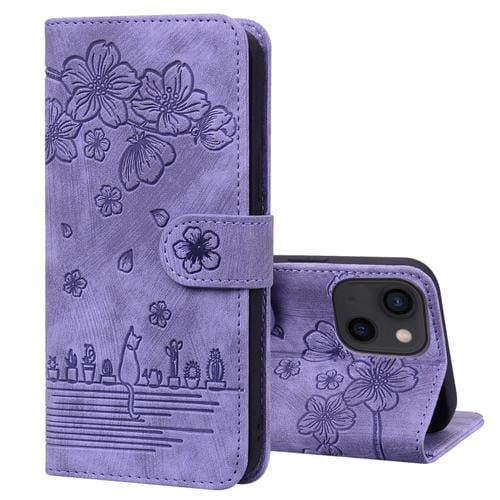 Funda para Teléfono iPhone 15 Cuero Relieve Gato Sakura Dibujos Animados (Púrpura)