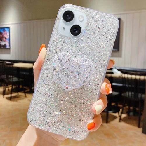 Funda para Teléfono iPhone 15 TPU Epoxi con Soporte Corazón Lentejuelas Estrelladas (Plateado)