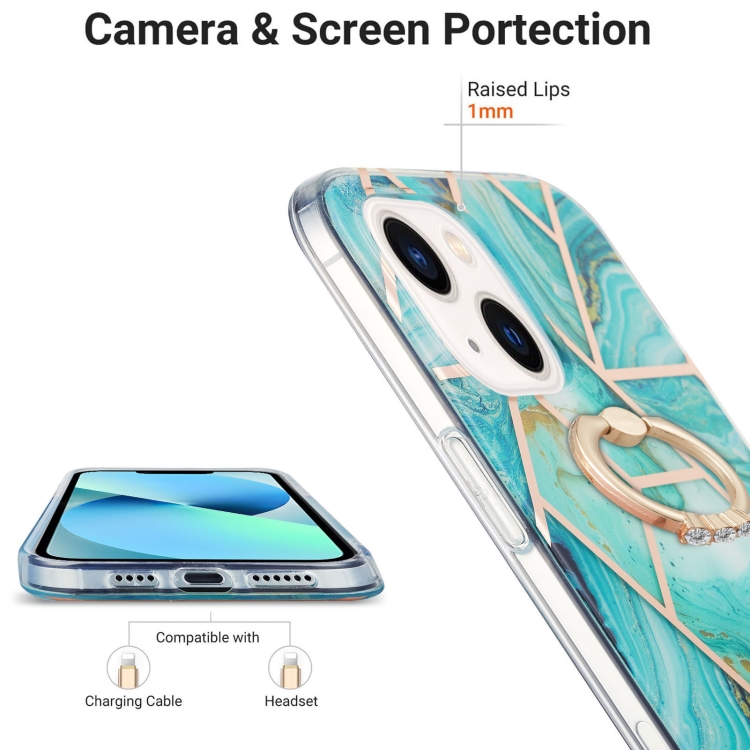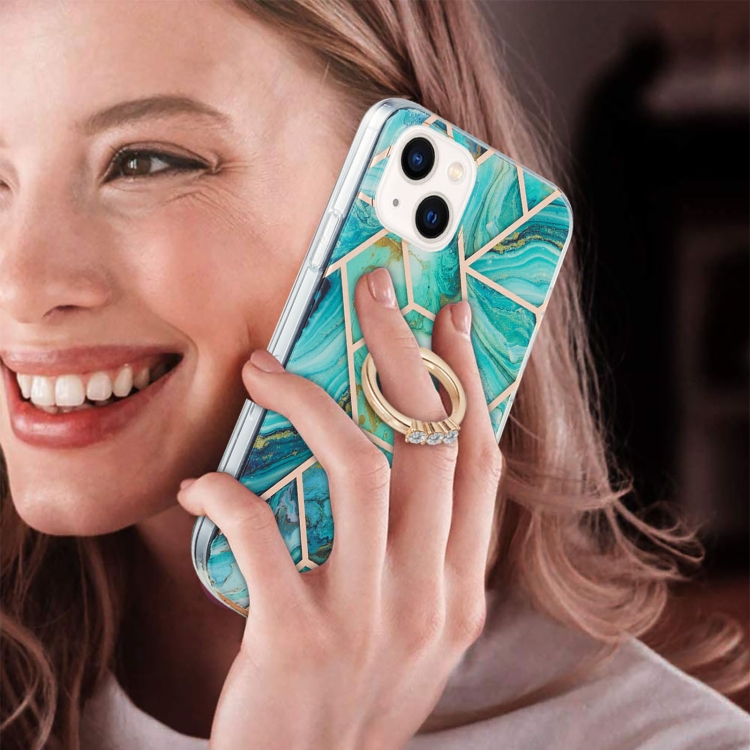 Estuche para iPhone 15 Galvanoplastia Empalme Mármol Patrón Imd TPU a Prueba de Golpes con Soporte para Anillo (Azul)