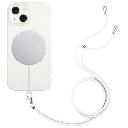 Funda para teléfono iPhone 15 Material de Paja Magnético Magsafe de Trigo con Cordón (Blanco)
