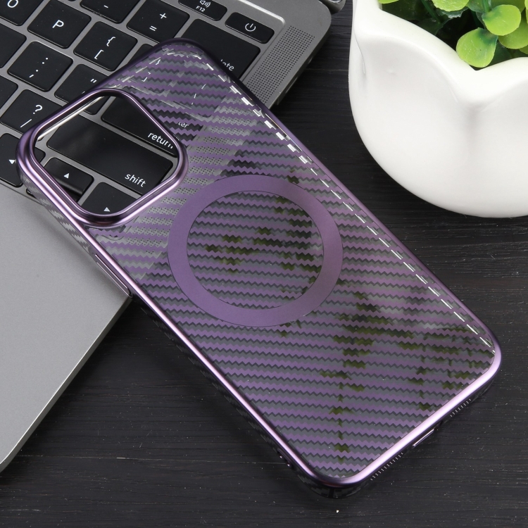 Caja de Teléfono para iPhone 15 Plus PC Magsafe Transparente con Fibra de Carbono (Púrpura Aurora)