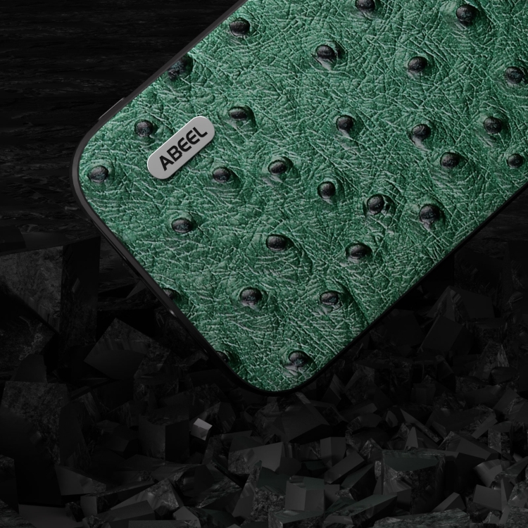 Funda de teléfono Abeel para iPhone 15 Plus con textura de avestruz de cuero genuino (Verde)