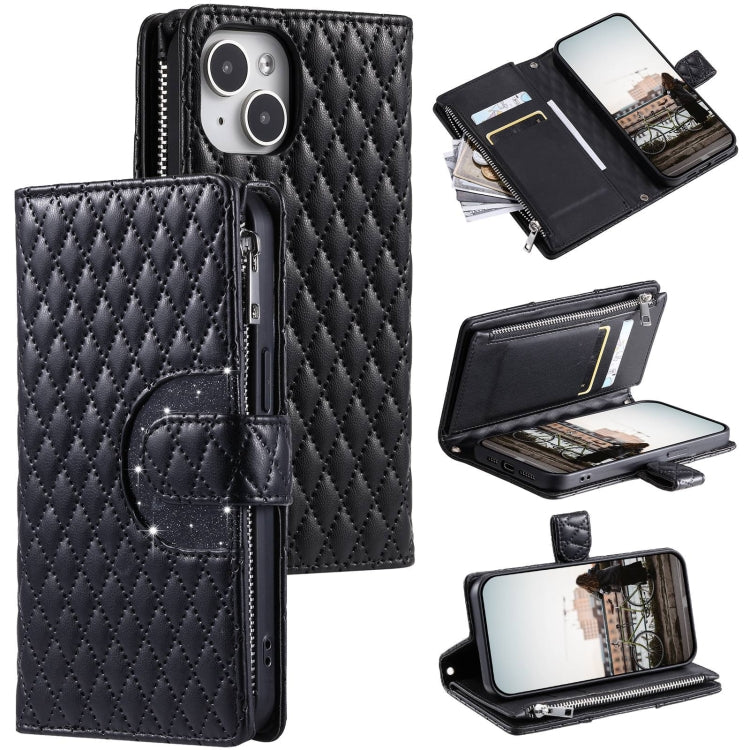 Estuche de Cuero para iPhone 15 Plus con Billetera, Cremallera y Celosía con Purpurina (Negro)