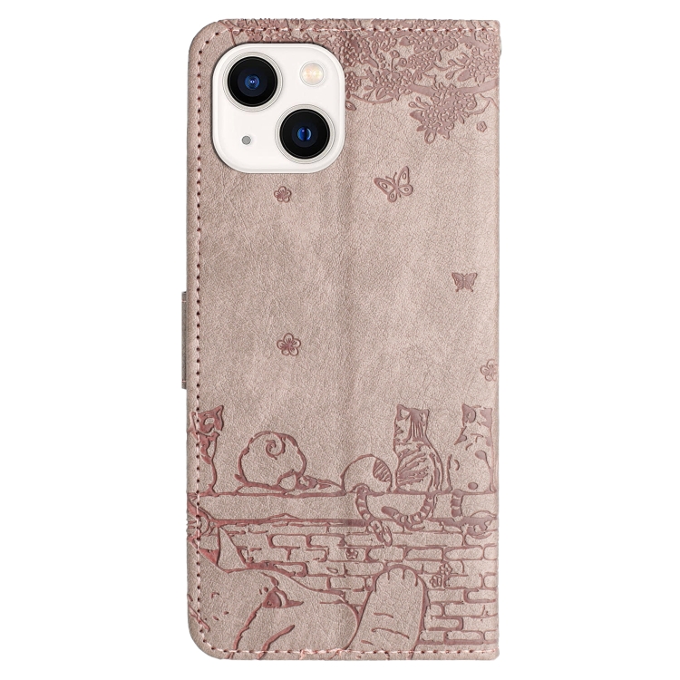 Estuche para teléfono iPhone 15 Plus cuero estampado gato en relieve con cordón (Gris)