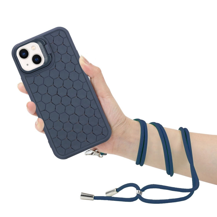 Estuche para Teléfono iPhone 15 Plus Magsafe Soporte para Lente Panal con Cordón (Azul)