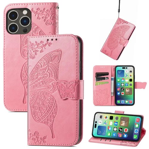 Estuche para Teléfono iPhone 15 Pro Butterfly Love Flower Cuero En Relieve (Rosa)