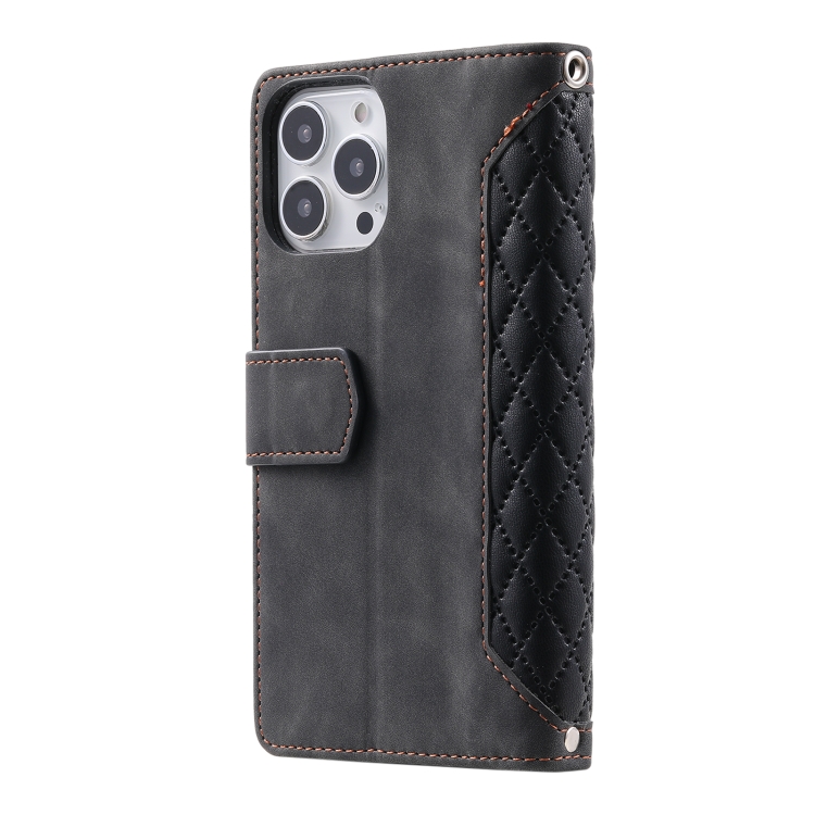 Funda para iPhone 15 Pro Cuero con Cremallera Textura de Rejilla y Cordón (Negro)