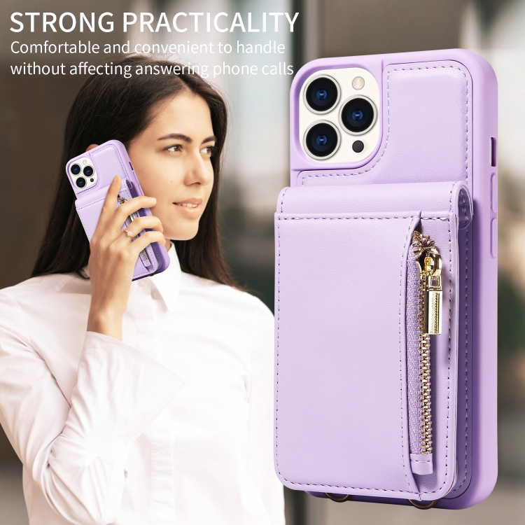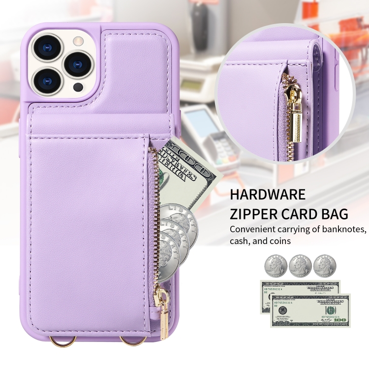 Funda para Teléfono iPhone 15 Pro Cuero con Billetera, Cremallera y Cordón Cruzado (Púrpura)