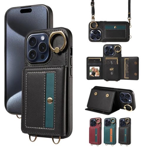 Funda para Teléfono iPhone 15 Pro Cuero Soporte para Anillo Bolso Cruzado para Tarjetas (Negro)