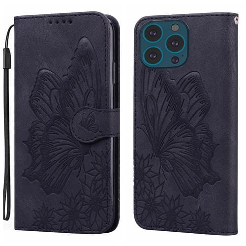 Funda de Teléfono iPhone 15 Pro Cuero Estampado Mariposas Sensación Piel Retro (Negro)