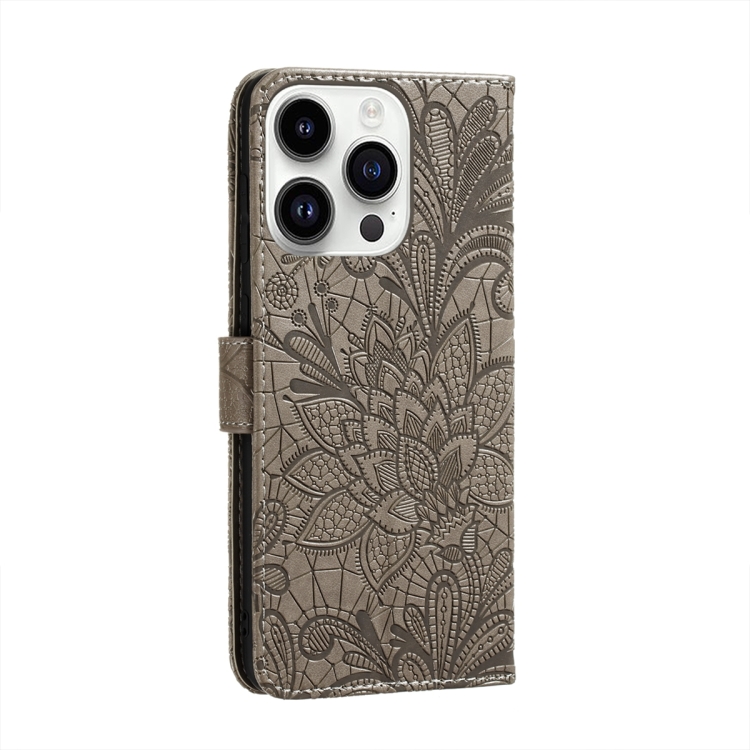 Funda para Teléfono iPhone 15 Pro Cuero con Tapa y Estampado de Flores de Encaje (Gris)