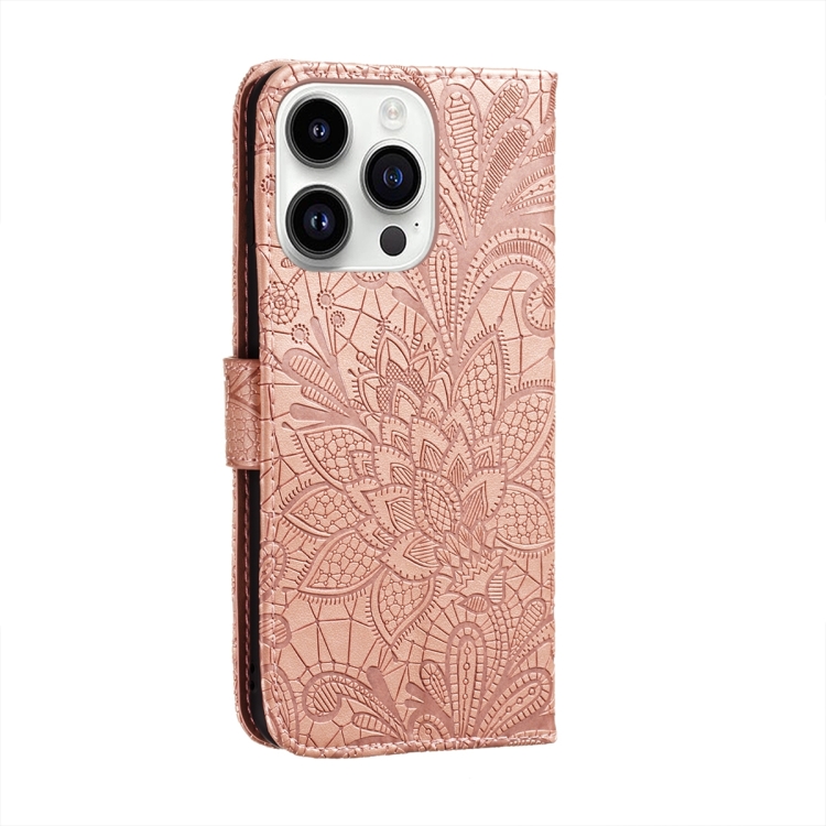 Funda para Teléfono iPhone 15 Pro Cuero con Tapa y Estampado de Flores de Encaje (Oro Rosa)