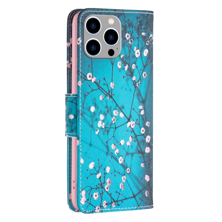 Estuche para Teléfono iPhone 15 Pro Max Cuero con Patrón de Dibujo Coloreado (Flor del Ciruelo)