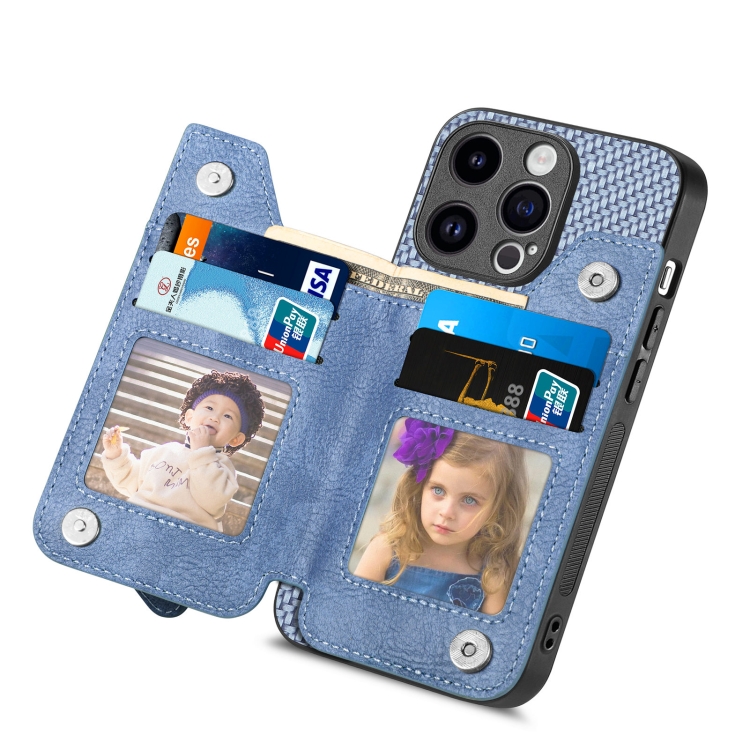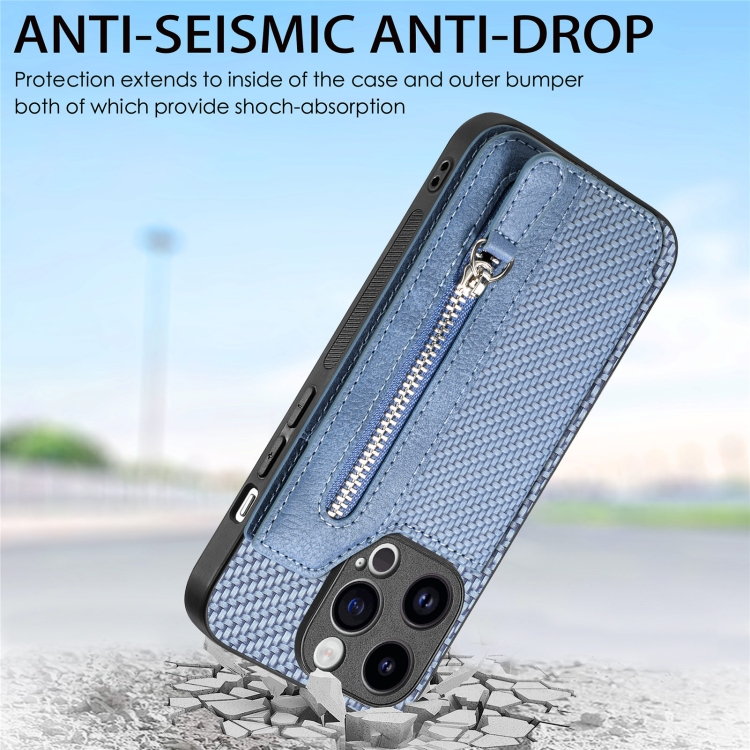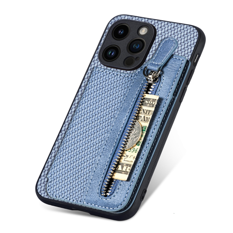 Funda para Teléfono iPhone 15 Pro Max con Billetera, Cremallera y Tapa Horizontal de Fibra de Carbono (Azul)