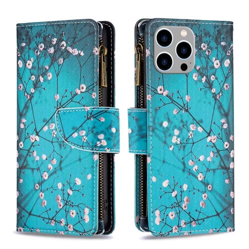 Funda de Cuero para iPhone 15 Pro Max Patrón de Dibujo Coloreado con Cremallera (Flor de Ciruelo)