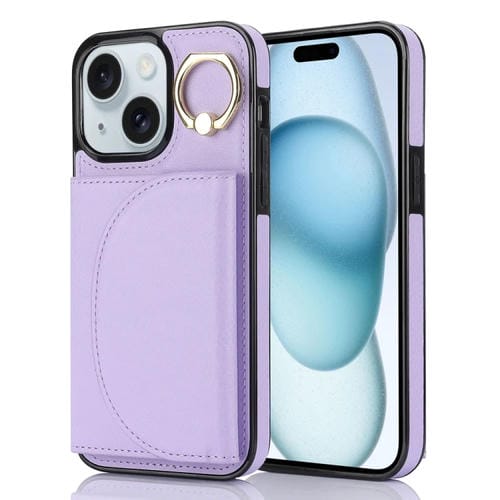 Funda para Teléfono Ym006 para iPhone 15 con Soporte para Anillo y Tarjeta con Sensación de Piel (Púrpura)