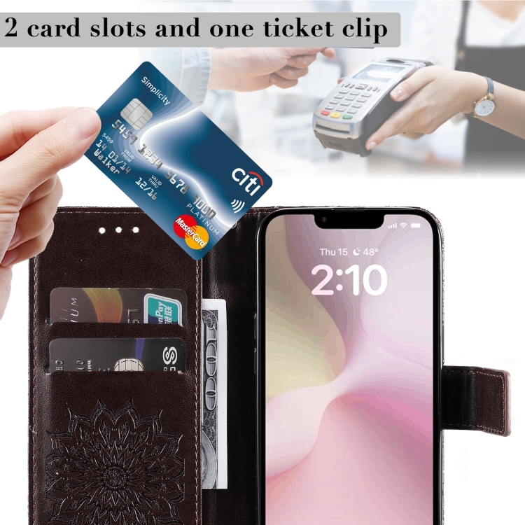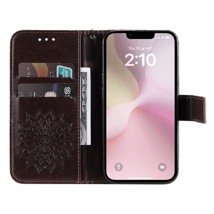 Funda de Cuero con Tapa y Estampado de Girasoles En Relieve para iPhone 16E (Marrón)