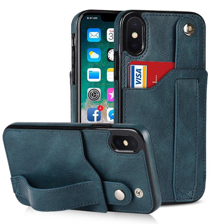 Funda para iPhone X Xs Crazy Horse Texture Cuero TPU PU a Prueba de Golpes Ranura Tarjeta Correa Muñeca (Azul Zafiro)