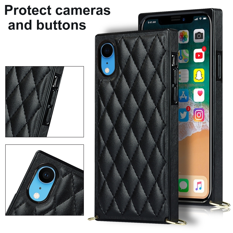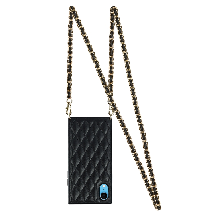 Estuche para iPhone Xr Microfibra Cuero TPU Patrón Rómbico a Prueba de Golpes con Cadena (Negro)