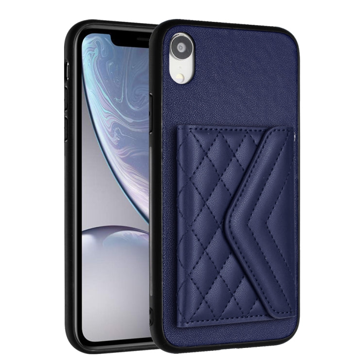 Estuche para Teléfono iPhone Xr Rfid con Bolsa para Tarjetas Textura Rómbica y Cordón Largo (Púrpura Oscuro)