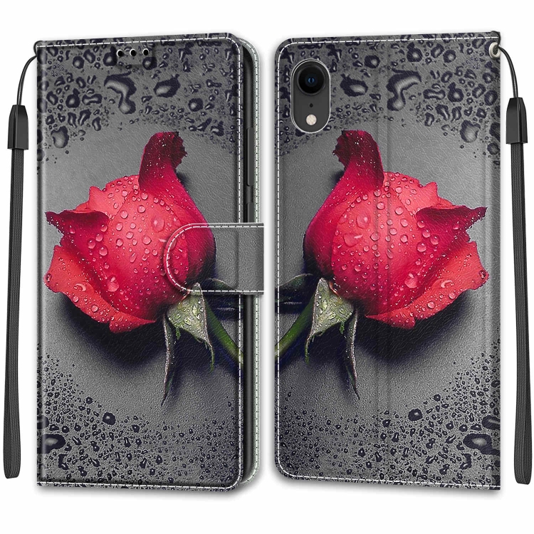 Funda de Cuero de Pu para iPhone Xr Cierre Magnético con Tapa Horizontal Soporte y Ranuras para Tarjetas (C14 Black Water Drop Rose)