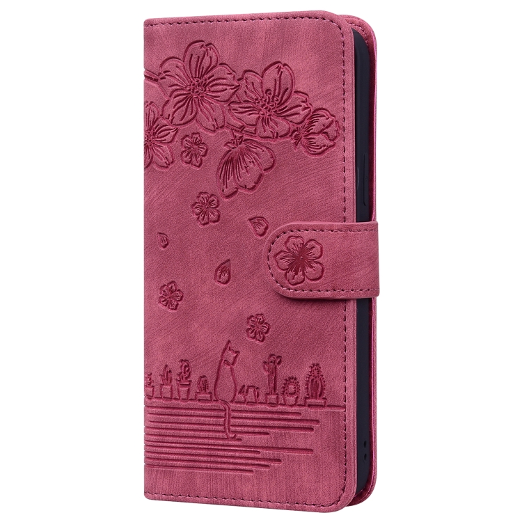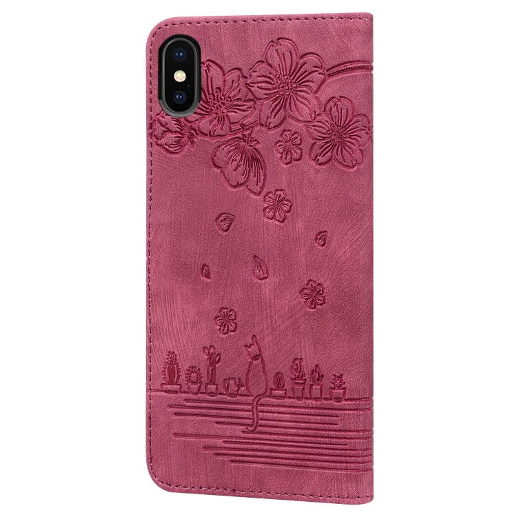 Estuche de Cuero para iPhone Xs Max Cartoon Sakura Cat En Relieve (Rojo Vino)