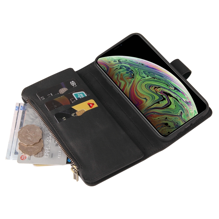 Estuche de Cuero para iPhone Xs Max Skin Feel PU + TPU con Tapa Horizontal, Soporte, Ranura para 15 Tarjetas, Billetera y Bolsillo con Cremallera (Negro)