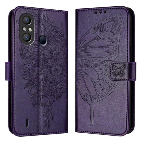 Funda para Itel A58 / A49 de Cuero con Mariposa en Relieve (Púrpura Oscuro)