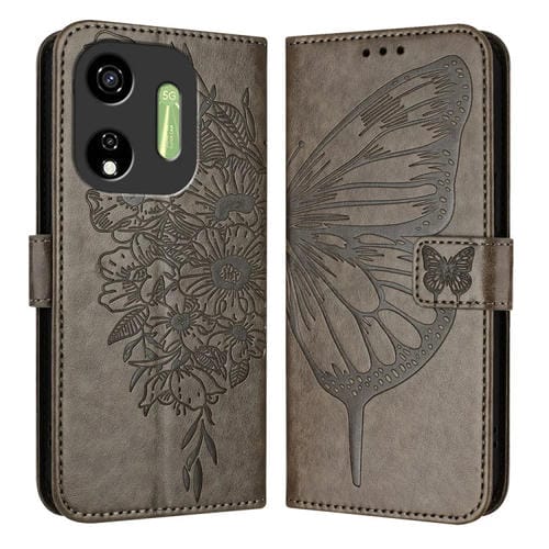 Funda de Cuero para Itel P55 5G con Mariposa en Relieve (Gris)