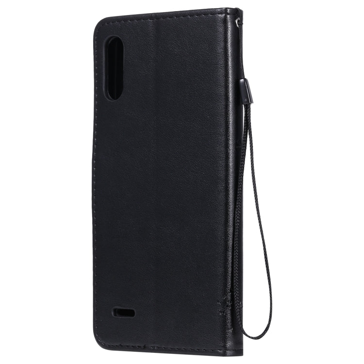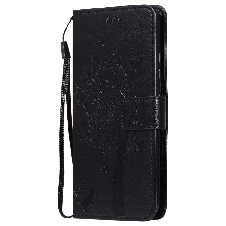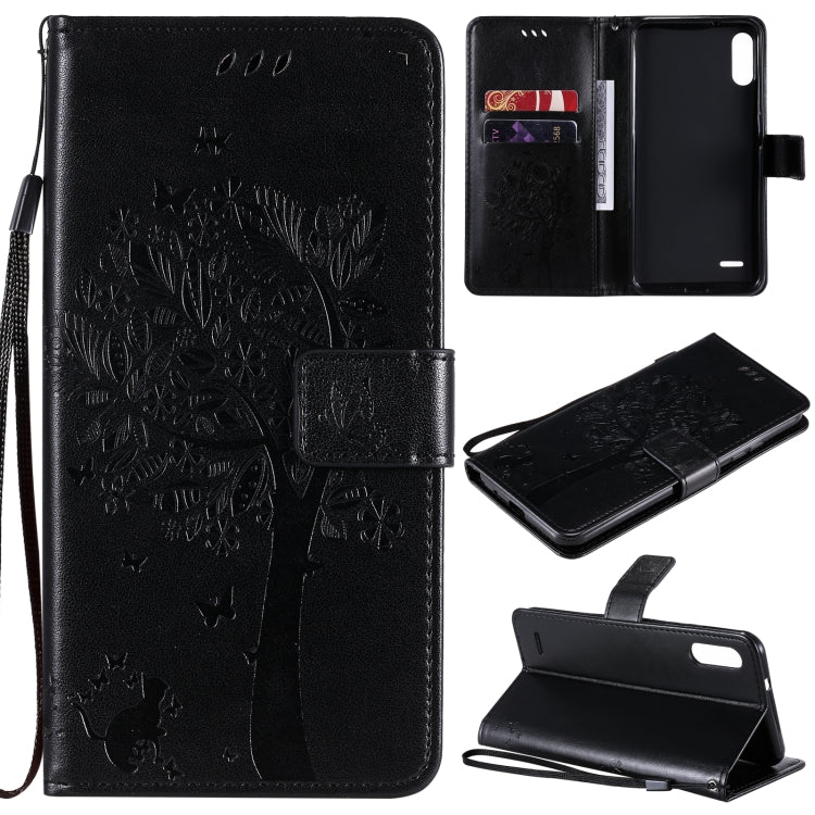 Funda Cuero PU para LG K22 / K22 Plus con Patrón Árbol y Gato, Tapa Horizontal, Soporte, Ranuras y Cordón (Negro)