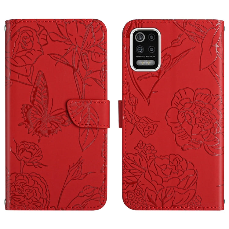 Funda de Cuero En Relieve para LG K52 Peonía y Mariposa (Rojo)