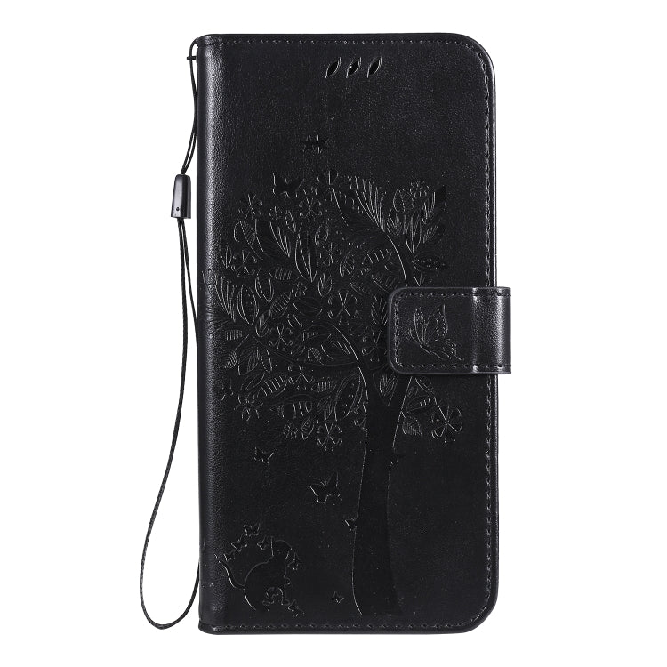 Funda de Cuero para LG K61 Tree & CAT con Tapa Horizontal, Patrón En Relieve, Soporte, Ranuras para Tarjetas y Cordón (Negro)