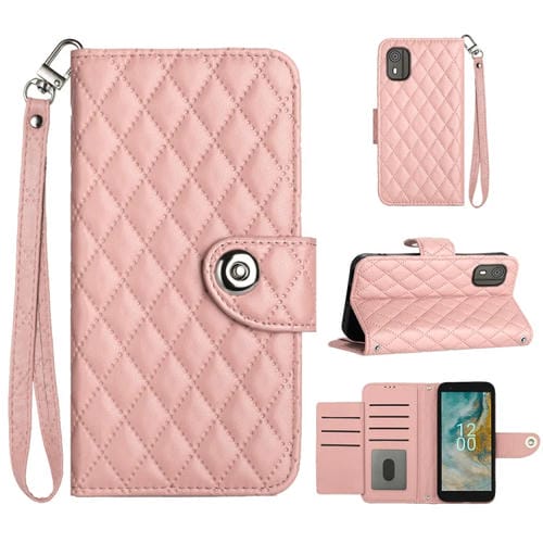 Funda de Cuero para Nokia C02 con Tapa, Textura Rómbica y Cordón (Rosa Coral)