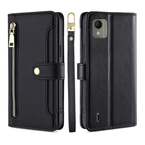 Funda de Cuero para Nokia C110 4G Lite con Billetera, Cremallera y Textura de Oveja (Negro)