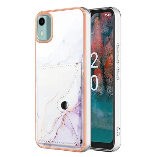Estuche para Teléfono Nokia C12 con Ranura para Tarjeta IMD Patrón Mármol (Blanco y Morado)