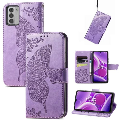 Funda para Nokia G42 de Cuero con Relieve Flor de Amor y Mariposa (Lavanda)