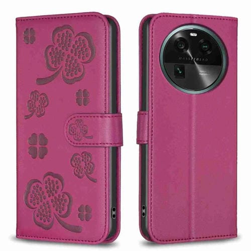 Para Oppo Find X6 Funda de Cuero con Relieve de Cuatro Hojas para Teléfono (Rojo Rosa)