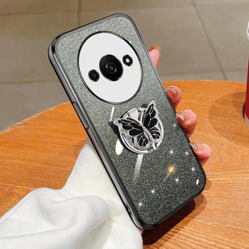 Para Redmi A3 Funda para Teléfono de TPU con Soporte de Mariposa con Brillo Degradado Plateado (Negro)