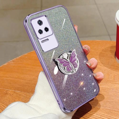 Para Redmi K40S Funda para Teléfono de TPU con Soporte de Mariposa con Brillo Degradado Plateado (Púrpura)